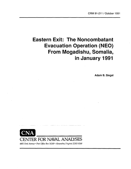 In early January 1991, U.S. military forces executed Operation Eastern Exit, a non combatant evacuation operation (NEO) of the U.S. Embassy in Mogadishu, Somalia. The primary forces involved in this ten-day operation were U.S. Navy and U.S. Marine forces diverted from Operation Desert Shield.