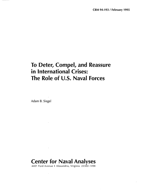 This paper provides some perspectives on the role of naval forces in deterrence, compulsion, and reassurance in the post-Cold War era. In addition to a brief overview of some of the theoretical issues surrounding deterrence, this paper focuses on some concrete examples of U.S. Navy and Marine Corps actions in response to or amidst inter national crises over the past 40 years. It discusses the ways these actions might have compelled an opponent to stop or reverse some action, deterred a potential adversary from taking some action, and/or reassured an ally to take some type of action. In addition to discussing naval forces, the specific case discussions outline the participation of the U.S. Army and Air Force; if they were not involved and we know the reasons they did not participate, I discuss those reasons. The discussion focuses on situations principally involving conventional forces (i.e., it does not examine U.S.-Soviet confrontations other than the Cuban missile crisis) in the hope of providing some illumination for the new security era.