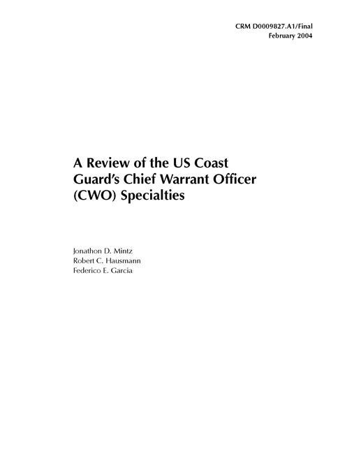The CWO community has a long history of serving the United States Coast Guard. A new effort, similar to the JRR, was required for CWOs—to identify the effects on the CWO community from changes in enlisted to CWO career paths, as well as occupational boundaries, the effects of future missions, and other issues in support of the Future Force 21 workforce initiatives. Therefore, the Coast Guard’s Assistant Commandant for Human Resources asked the Center for Naval Analyses to evaluate the CWO specialty structure and make recommendations to strengthen the CWO corps.