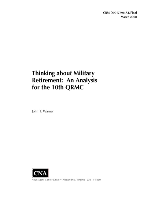 Opponents of change to the retirement system have argued that a new system would be too risky and would fail to provide the same quality force as the current system. The fifth section uses an economic model developed by Asch and Warner to estimate how the experience mix of the Army’s enlisted force would change under four alternative systems and how much costs would change. I find that three of these plans would maintain or increase the quality and average experience level of the force without an increase in cost. These plans would contribute to the old-age needs of a much larger portion of the force while providing DOD and the services with better force shaping tools. In sum, there is a case for changing the retirement system.