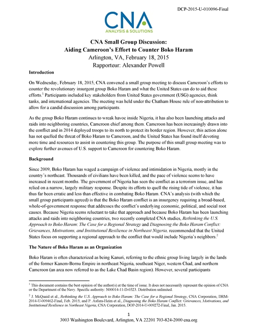 On Wednesday, February 18, 2015, CNA convened a small group meeting to discuss Cameroon’s efforts to counter the revolutionary insurgent group Boko Haram and what the United States can do to aid these efforts. Participants included key stakeholders from United States government (USG) agencies, think tanks, and international agencies. The meeting was held under the Chatham House rule of non-attribution to allow for a candid discussion among participants.
