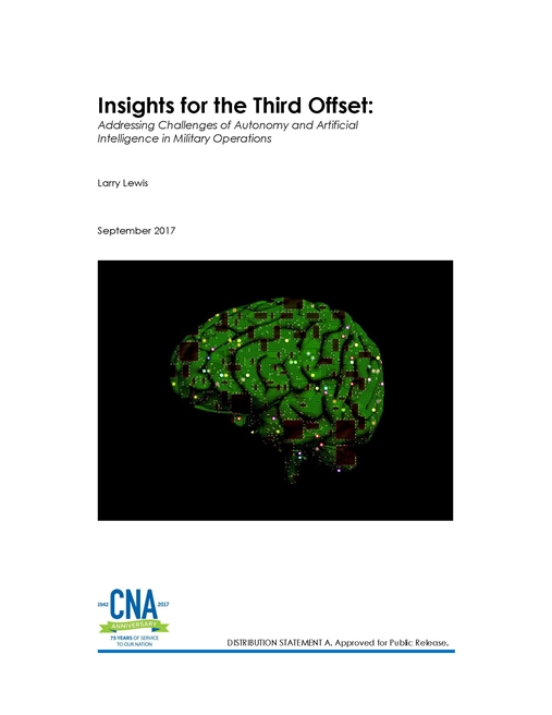 This report examines each area of concern, based on CNA’s experience in conducting objective analysis of U.S. military operations, as well as its expertise in autonomy and other aspects of AI. Though much of the emerging technology is new, the approach of applying lessons from U.S. operations and institutional processes to key challenges in leveraging autonomy and AI continues CNA’S applied research paradigm of exploring many opportunities to resolve or work around challenges that have been seen before. The report concludes with concrete recommendations for better leveraging these technologies in support of the Third Offset strategy. It also discusses how this effort does not have to sacrifice U.S. principles and values for military effectiveness. Both goals are possible: making autonomy and AI militarily effective from an acquisition and operational perspective, and pursuing these capabilities in ways that are consistent with longstanding U.S. principles in the advancement of broader U.S. national interests.