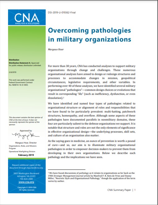 For more than 30 years, CNA has conducted analyses to support military organizations through change and challenges. These numerous organizational analyses have aimed to design or redesign structures and processes to accommodate changes in mission, geopolitical circumstances, legislative requirements, and other variables. In performing over 40 of these analyses, we have identified several military organizational “pathologies”—common design choices or evolutions that result in corresponding “ills” (such as inefficiency, dysfunction, or even dissolution).
