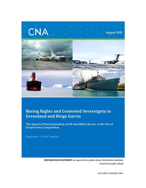 On August 21, 2019, CNA’s Strategy and Policy Analysis program hosted an on-the-record event to discuss how recent developments in sovereignty politics could affect US military basing rights around the world, particularly in Greenland and Diego Garcia. Both are currently part of US allies’ territories—the former as a constituent within the Kingdom of Denmark and the latter as the largest island in the British Indian Ocean Territory—but the status of either one (or both) could change, if Mauritius successfully pressures the UK to cede Diego Garcia, or if Greenland acquires its independence. The event featured CNA senior vice president Mr. Mark Rosen, CNA analyst Dr. Steven Wills, and Ms. Rachel Ellehuus, deputy director of the Center for Strategic and International Studies’ Europe program. Ms. Nilanthi Samaranayake, director of CNA’s Strategy and Policy Analysis program, moderated the conversation. Panelists appraised recent developments with Greenland and Diego Garcia in their historical perspective, as well as the strategic and operational advantages of US access to the two locations. Discussants noted that the bases are key enablers of US military missions, from force projection to submarine tracking, yet agreed that the US approach to basing could benefit from both a greater appreciation of long-term strategic needs and a more concerted effort to make US bases acceptable to local populations and their governments.