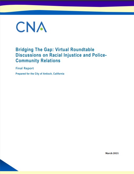 In the City of Antioch, hundreds of concerned community members voiced their opinions on race relations and policing reform during three City Council meetings in June 2020. The issues they raised were wide ranging, including systemic racism, body-worn cameras, and police recruitment, training, and accountability. In response, the Antioch City Council decided to hold a series of roundtable discussions called Bridging the Gap to hear the perspectives of additional community members and learn more about the kinds of changes in policing the community desired. The City wanted to better understand the community’s perspectives on racial injustice and police-community relations and to identify ways to address them. CNA, an independent national research and analysis firm, was hired to organize and facilitate these roundtable discussions.