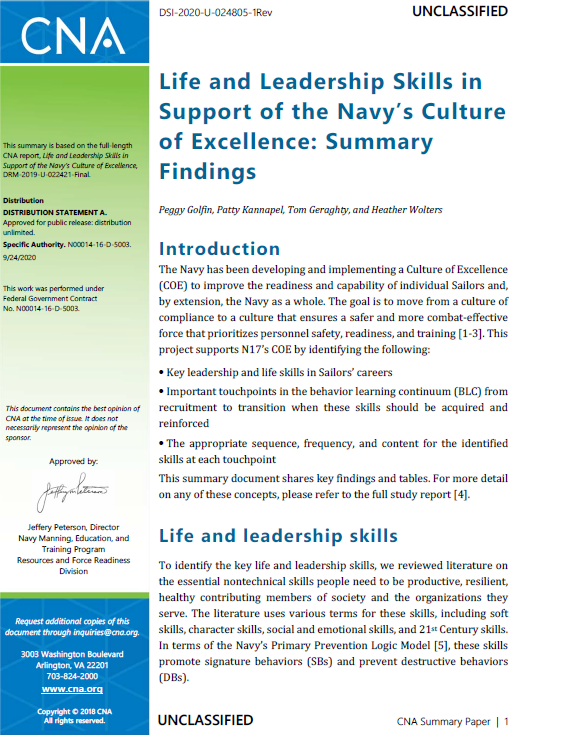 This summary is based on the full-length CNA report, Life and Leadership Skills in Support of the Navy’s Culture of Excellence, DRM-2019-U-022421-Final.