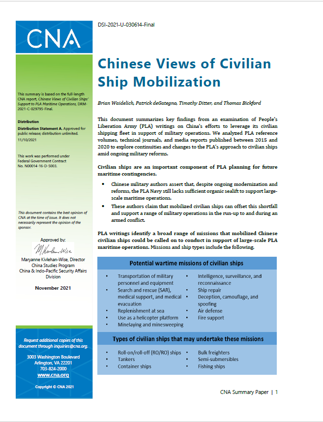 This document summarizes key findings from an examination of People’s Liberation Army (PLA) writings on China’s efforts to leverage its civilian shipping fleet in support of military operations. We analyzed PLA reference volumes, technical journals, and media reports published between 2015 and 2020 to explore continuities and changes to the PLA’s approach to civilian ships amid ongoing military reforms.