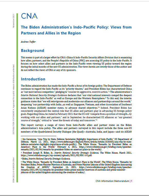 This report surveys a range of views from Indo-Pacific allies and partner states on the Biden administration’s Asia policy. The allies and partners surveyed in this report include the three non-US members of the Quadrilateral Security Dialogue (the Quad)—Australia, India, and Japan—and six ASEAN states: Indonesia, Malaysia, Thailand, the Philippines, Singapore, and Vietnam. Because officials are often constrained in what they can say publicly, this report primarily examines the perspectives of think tank analysts (especially those with government affiliations) and opinion leaders, all of whom tend to enjoy greater latitude in expressing their views. While the views expressed by regional subject matter experts (SMEs) should not necessarily be construed as presenting the official positions of their governments, these individuals are, at a minimum, shaping public opinion and in some cases may be informing policy-makers. Given the premium that the Biden administration has placed on strengthening ties with allies and partners across the Indo-Pacific, knowledge of major currents of thinking in partner and ally states on the administration’s policies in the region should have particular utility.