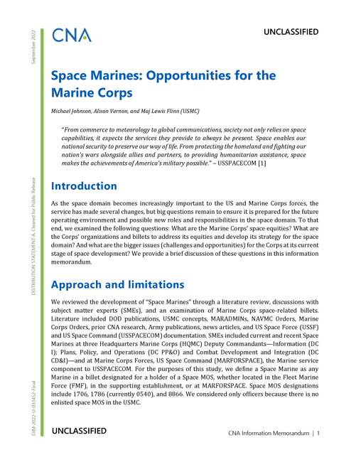 We reviewed the development of “Space Marines” through a literature review, discussions with subject matter experts (SMEs), and an examination of Marine Corps space-related billets. Literature included DOD publications, USMC concepts, MARADMINs, NAVMC Orders, Marine Corps Orders, prior CNA research, Army publications, news articles, and US Space Force (USSF) and US Space Command (USSPACECOM) documentation. SMEs included current and recent Space Marines at three Headquarters Marine Corps (HQMC) Deputy Commandants—Information (DC I); Plans, Policy, and Operations (DC PP&O) and Combat Development and Integration (DC CD&I)—and at Marine Corps Forces, US Space Command (MARFORSPACE), the Marine service component to USSPACECOM. For the purposes of this study, we define a Space Marine as any Marine in a billet designated for a holder of a Space MOS, whether located in the Fleet Marine Force (FMF), in the supporting establishment, or at MARFORSPACE. Space MOS designations include 1706, 1786 (currently 0540), and 8866. We considered only officers because there is no enlisted space MOS in the USMC.