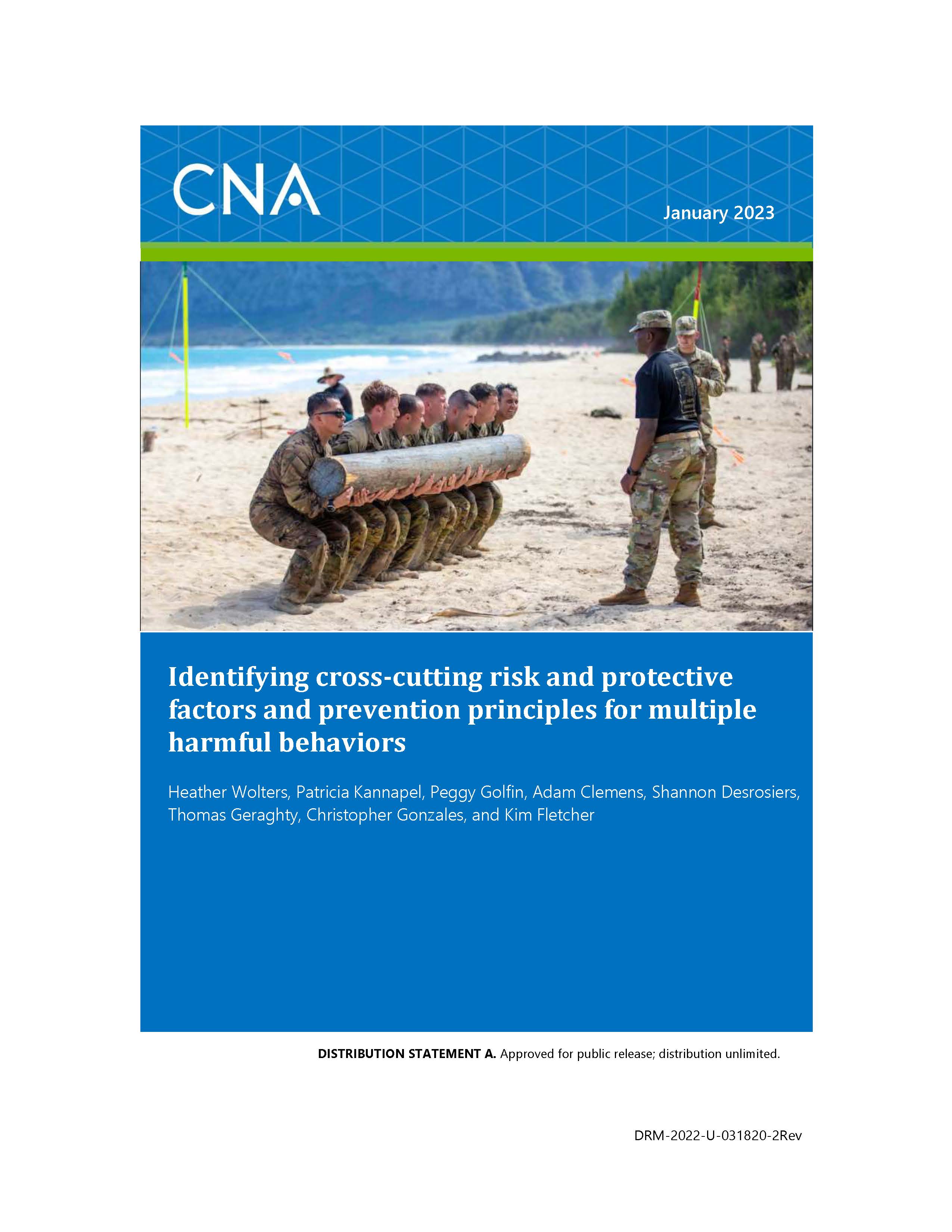 The Army Resilience Directorate (ARD) asked CNA to assist the Army in better understanding cross-cutting (shared) risk and protective factors associated with multiple harmful behaviors: suicide, substance misuse, domestic violence, sexual harassment and assault, discrimination, and extremism. Specifically, ARD wants us to identify cross-cutting risk and protective factors at each level of a socio-ecological model (SEM) that considers influences on behavior at the individual, interpersonal, community, and society levels. This study supports ARD initiatives to develop integrated prevention strategies that enhance the protective factors and mitigate the risk factors at appropriate touchpoints across Soldiers’ careers. This integrated prevention approach aligns with recommendations from the Centers for Disease Control and Prevention and recent efforts within the Department of Defense (DOD) and the Army.