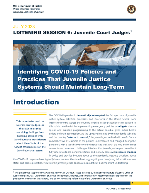 Our 2021 National Institute of Justice (NIJ)-funded project—Juvenile Justice Responses to the COVID-19 Pandemic—involves several research activities, including listening sessions, a systematic literature review, policy scan, and case studies.