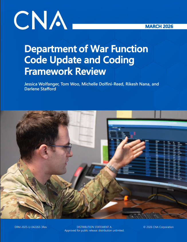 Historically, DOW function codes, submitted annually in the Inherently Governmental and Commercial Activities Inventory, have been relied on to identify work that could be considered for competition with the private sector and have been associated with the Office of Management and Budget Circular A-76 processes. Although the A-76 program remains suspended, the pressure to shape the total force effectively and economically—coupled with sustained scrutiny on the size, shape, structure, and workload alignment across the total force—means that these function codes must remain relevant and current. The current set of function codes, however, has not been reviewed since the previous CNA study in 2019,1 and the recommended code revisions from that study were not implemented at the time; the 2010 function codes remain active. Therefore, TFM&RS asked CNA to review the function codes again and to determine additional changes to the codes required by changes in work performed by DOW in the past five years.