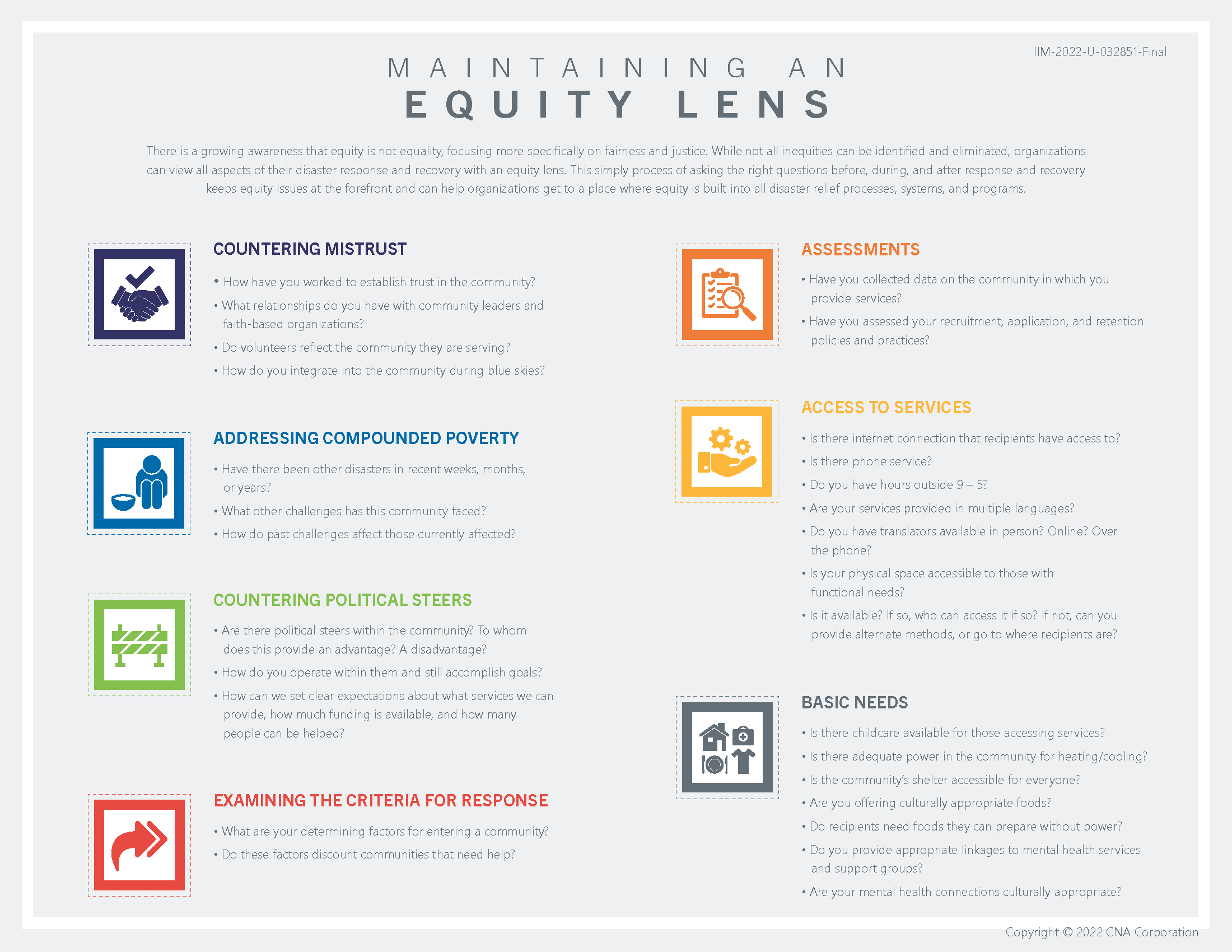 A simple process of asking the right questions before, during, and after disasters keeps equity issues at the forefront and can help organizations get to a place where equity is built into all disaster relief processes.