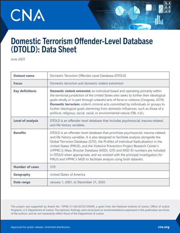 Targeted violence is on the rise in the United States. Domestic terrorism, hate crimes, mass shootings, and school shootings were once considered relatively rare. But such targeted violence now occurs almost daily and threatens the safety and security of communities across America. CNA helps our sponsors and the public to better understand the nature and scope of this threat through analysis and program evaluation projects conducted in communities across the country. By leveraging expertise in domestic terrorism and targeted violence, CNA analysts are equipping practitioners with the knowledge and tools to combat targeted violence.