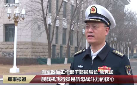 Senior Captain Zhan Kejia, head of the PLA Navy's officer management bureau, discusses the new recruitment drive on the nightly news program Military Report. The bottom caption reads "shipborne aircraft aviators are the core of carrier combat power."