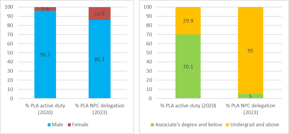 The two graphs below display these data about the gender composition and education levels of the PLA NPC delegation versus the active duty force.