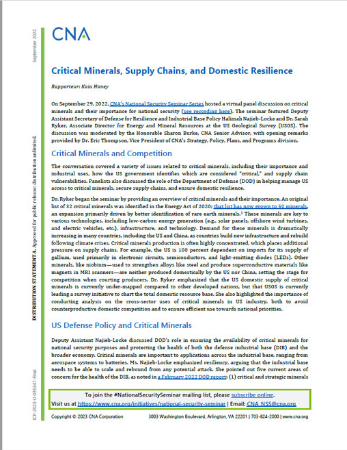 On September 29, 2022, CNA’s National Security Seminar Series hosted a virtual panel discussion on critical minerals and their importance for national security (see recording here). The seminar featured Deputy Assistant Secretary of Defense for Resilience and Industrial Base Policy Halimah Najieb-Locke and Dr. Sarah Ryker, Associate Director for Energy and Mineral Resources at the US Geological Survey (USGS). The discussion was moderated by the Honorable Sharon Burke, CNA Senior Advisor, with opening remarks provided by Dr. Eric Thompson, Vice President of CNA’s Strategy, Policy, Plans, and Programs division.