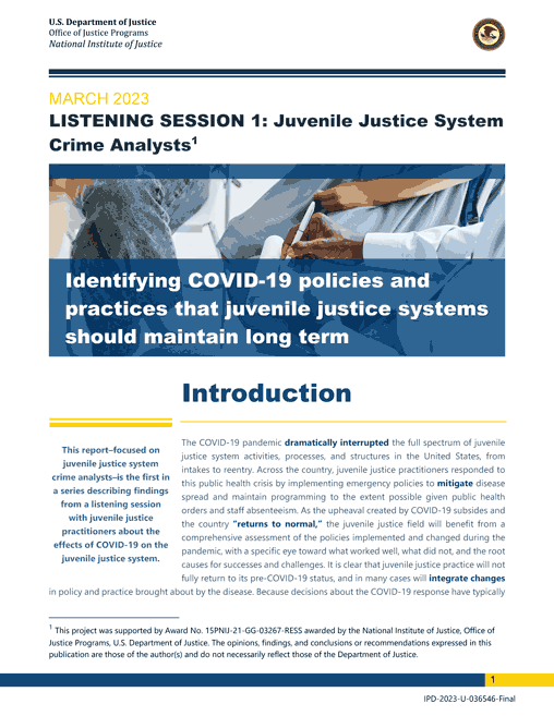 Our 2021 National Institute of Justice (NIJ)-funded project—Juvenile Justice Responses to the COVID-19 Pandemic—involves several research activities, including listening sessions, a systematic literature review, policy scan, and case studies.