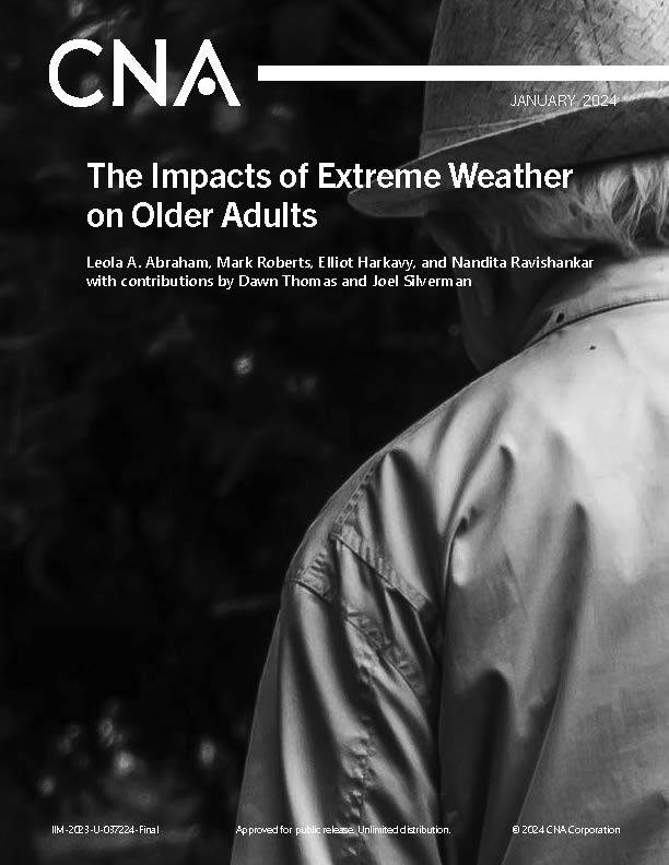 In this report, CNA’s Center for Vulnerable Population Protection examines how climate-related extreme weather events affected the health, housing, and economic security of older adults over the past 10 years. This report defines extreme weather by the type of hazard (e.g., drought, heat wave, flooding, severe storm, wildfire, winter weather, tropical cyclone (hurricane)) and level of risk (at the county level). CNA examined counties in four states—Arizona, California, Florida, and Missouri—focusing on health, housing, and economic effects and how governments (including emergency management) supported older adults during the planning for, response to, and recovery from natural disasters.